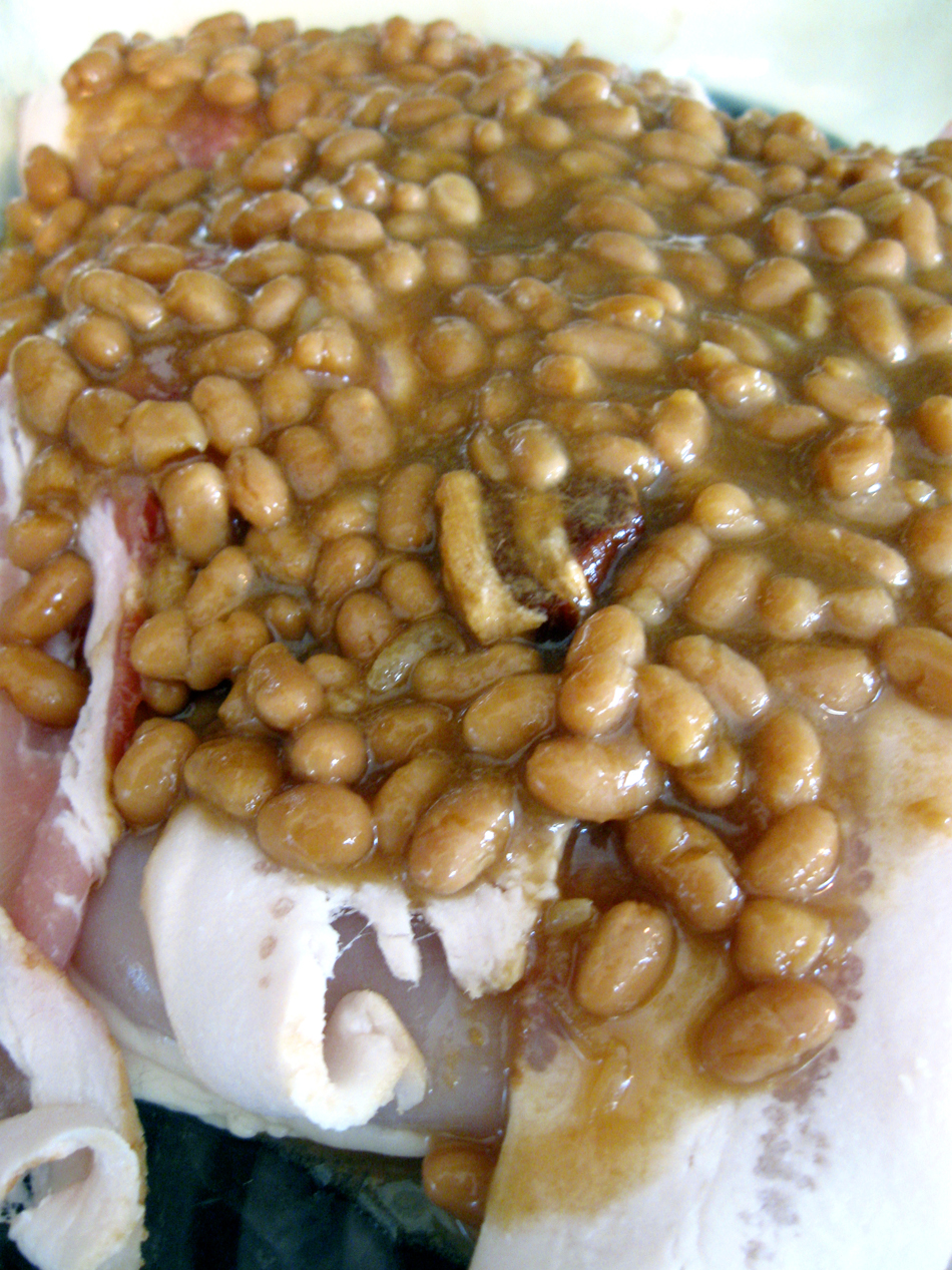 I heated up the oven a bit and got out a couple 9 x 13 glass dishes. I then did what any guy would do; I laid the chicken breasts in the casseroles, laid the strips of hickory-smoked bacon on the chicken, dumped some maple baked beans on top of the bacon, and shoved them in the oven, hoping through it all they’d at least be edible.