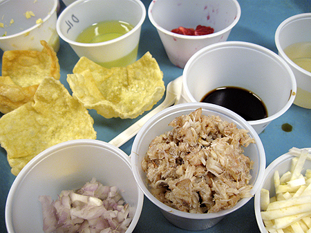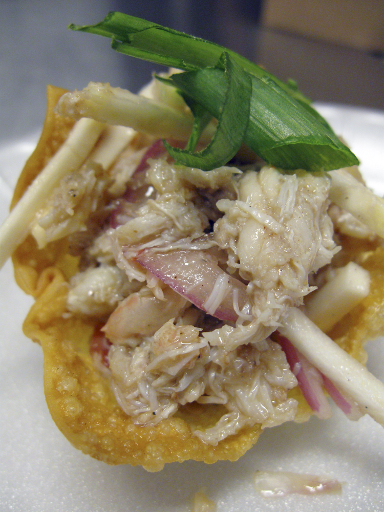 This is a Crab Wonton. It’s a deep-fried wonton wrapper with a crab filling made with red onions, celery root and other delectable things.