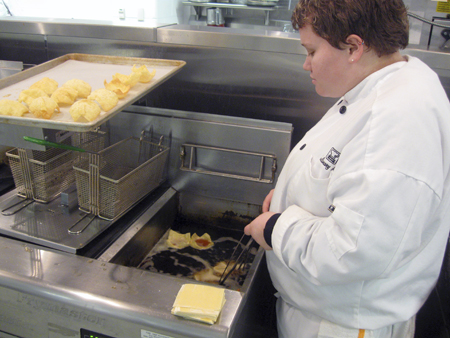 A student deep fries the wonton wrappers. The technique is to initially form the wrapper into a cup between two ladles, and then let them crisp in the fryer before laying them to drain on wax paper.