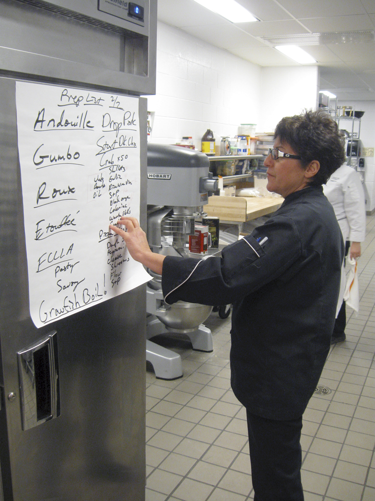 Chef Instructor Denise Schaefer checks the prep list. Students were preparing trays with ingredients for the Crab Wontons and fresh Mini Pizzas for guests to prepare in the Teaching Kitchen.