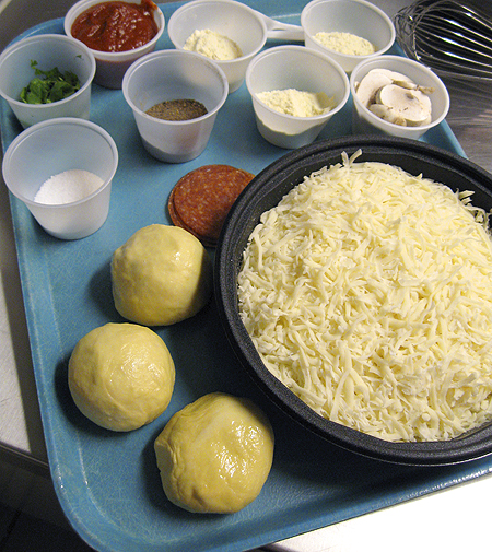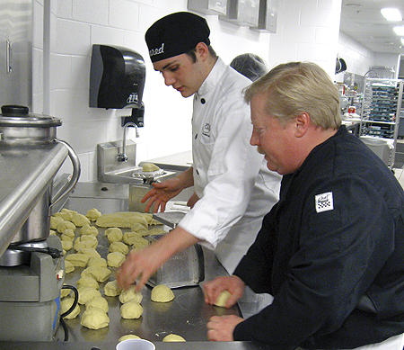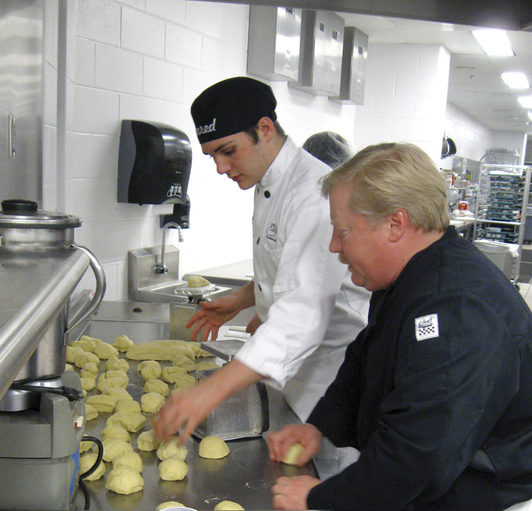 Chef Instructor Mike Sader assists students in preparing pizza dough in the Restaurant Kitchen.