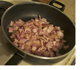 But something else was key here. I found we achieved an amazing color and flavor simply by using the freshest bacon I could find. This was some fresh, hickory-smoked, thickly-cut bacon from the cutters at Jerry’s Market in Tecumseh. Because of this bacon, the whole dish turned out beautifully.