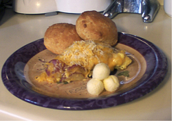 When the egg mixture is almost fully cooked, dump the shredded cheese on the top of it all. Spread the cheese around as though it’s on a pizza. Wait about another minute, and then remove the skillet from the heat. Let it sit for a minute or two so everything will congeal, then cut it all into eight wedges. Serve each wedge with warm biscuits and butter.