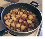 Once the bacon is draining on the paper towel on the plate, discard most of the bacon oil in the skillet, leaving less than 1/8″. Set the skillet over medium-to-high heat and let it pre-heat. When the oil is hot enough, add the potato slices to the skillet. Stir the potatoes frequently so they’ll brown in the bacon oil but not scorch. When they’re just barely starting to brown, add the chopped onion. Continue cooking until the sliced potatoes are a golden brown, and the onions are just beginning to caramelize. When you reach this point, give the eggs a quick mix with the fork, and dump them on top of the potato and bacon mixture.