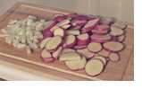 While the bacon is cooking, wash the redskin potatoes under cold water and remove any eyes. Slice the potatoes into 1/8″ slices and set them aside. Also, go ahead and chop the onion, making sure to keep the onion and the potatoes separated. Finally, break the eggs into a large mixing bowl (yes, take a bowl camping!) and, if you’d like, add the milk. Mix the eggs well with a fork. You may want to keep the sliced potatoes in cold water while the bacon finishes cooking. This will keep the potatoes from turning brown from exposure to the air.