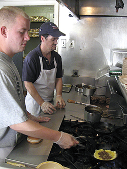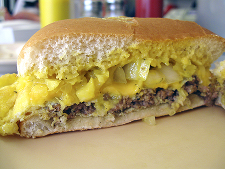 The way they do it is like this: Quarter-pound burgers are kept in supply throughout the day, made from fresh-ground beef grilled on a small grill next to the stove. The grill has a rotating lid to cover the burgers so they cook up correctly. When a customer orders a Cheesy Western, two eggs are beaten and poured into a small skillet. When they’re almost done the egg is flipped. One of the quarter-pound burgers is laid on the egg and a slice of American cheese is placed on the burger. The whole of it is laid on the bottom of the bun. The top of the bun has a “super-secret” sweet mustard relish spread on it that they make at the Inn, and chopped onions. This is then laid on top of the now-cheesy innards, the whole of it is cut in two for easier handling, plated and served.