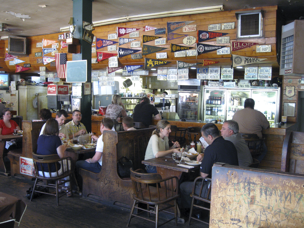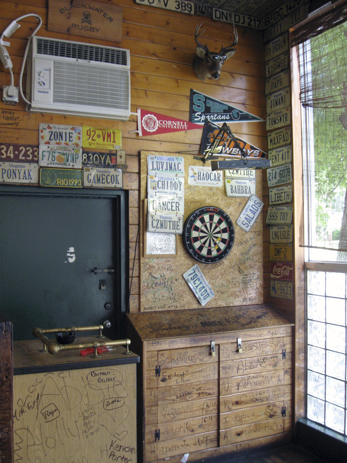 The place is … unique. From the outside it could be a dry goods store, with its aluminum window frames and glass block halfway up the front wall. Inside, the wood walls were either inscribed with personal graffiti or covered with license plates, flags, and Lord knows what else. For only being there 22 years, it looks a lot older.