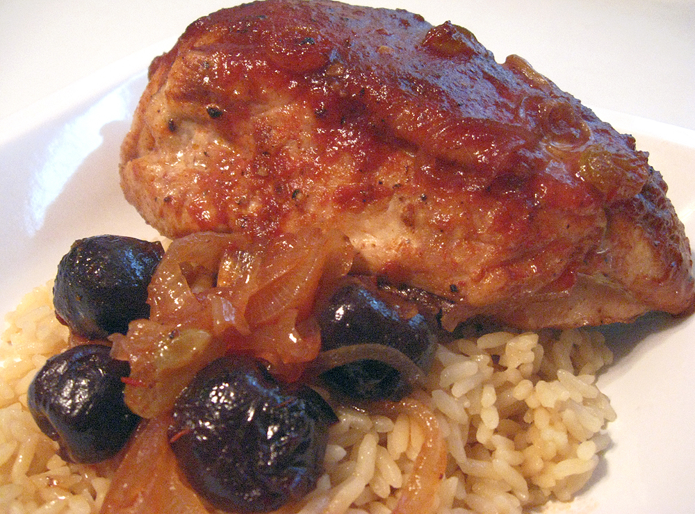 8. Spoon the onions, cherries, and raisins over the chicken, and pass the sauce.