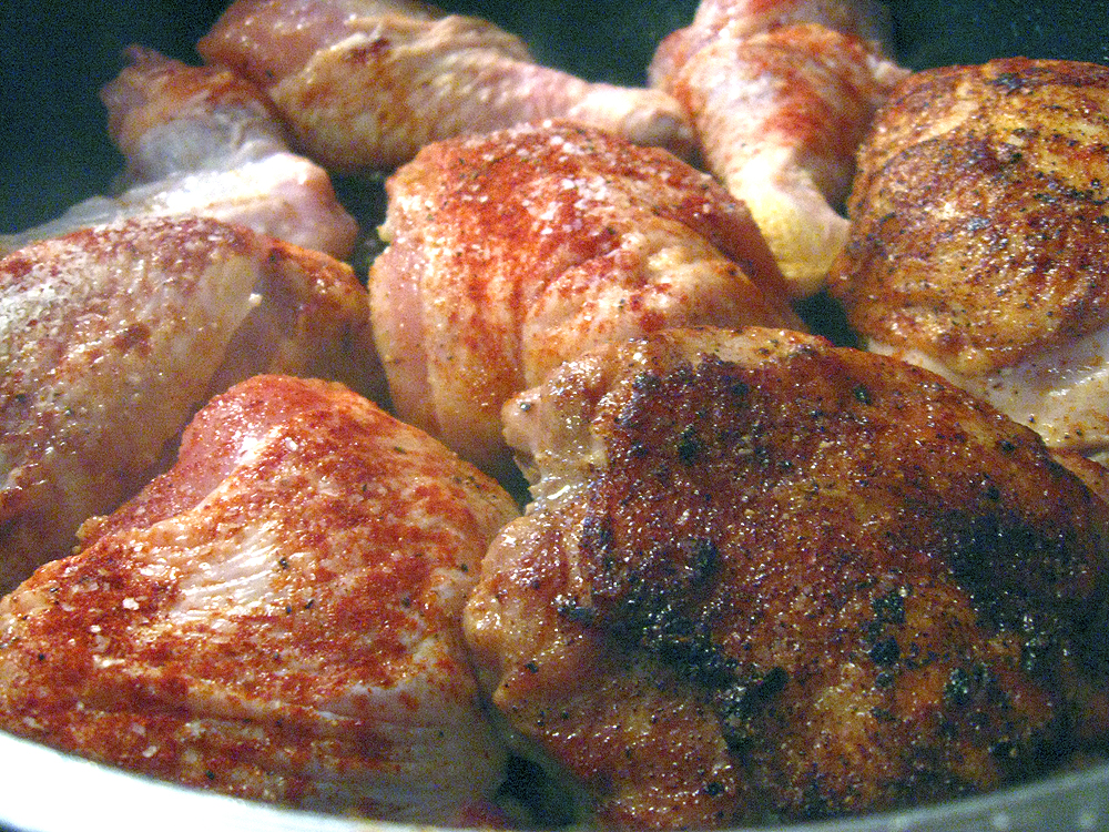 The seasoned chicken being browned in a large skillet. Note how the pieces progress from unbrowned at top-left to browned at bottom-right.