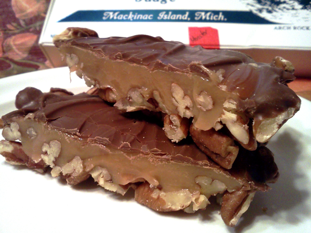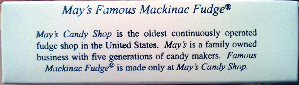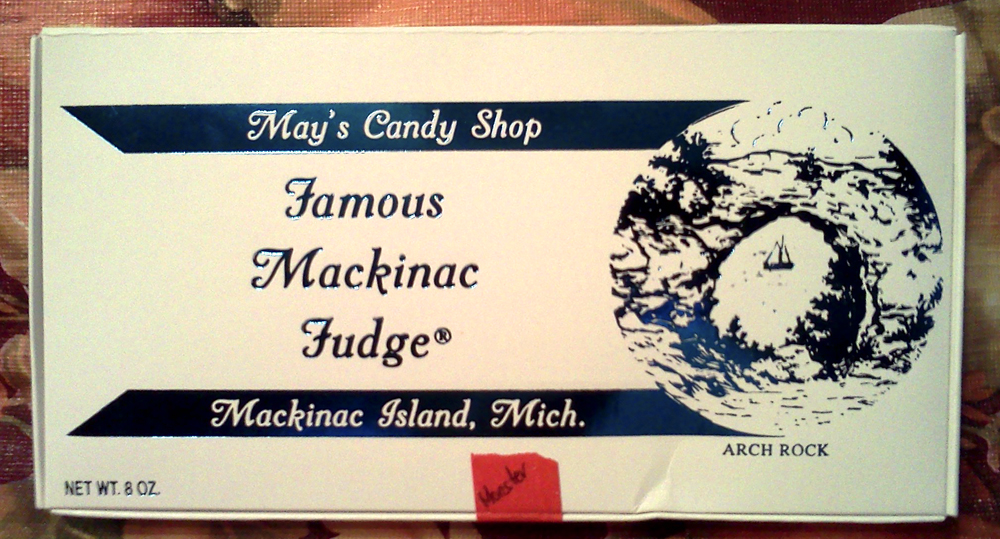 The box itself is a classy thing on its own, being covered with foil-stamped white glossy paper. The old-style image of Arch Rock, a popular tourist attraction on the island, actually shows proper perspective of a sailboat on Lake Huron as seen through the opening in the rock from the correct height and distance. And while the box is definitely intended for use with May’s well-known fudge, the writing on the red tape holding it closed told what was actually inside.
