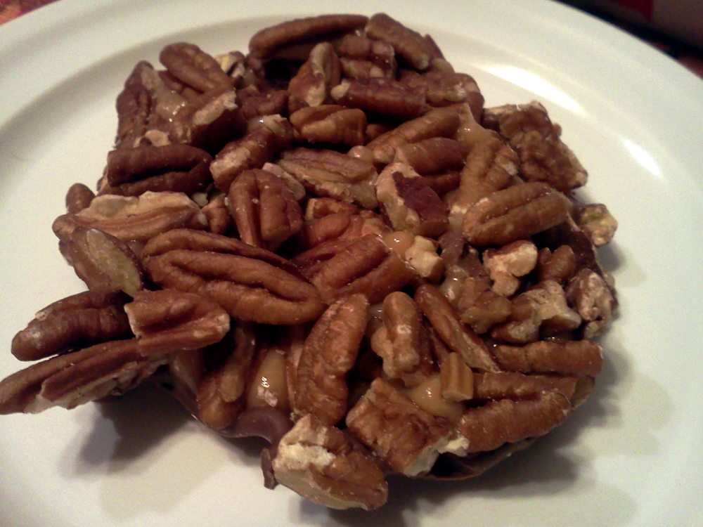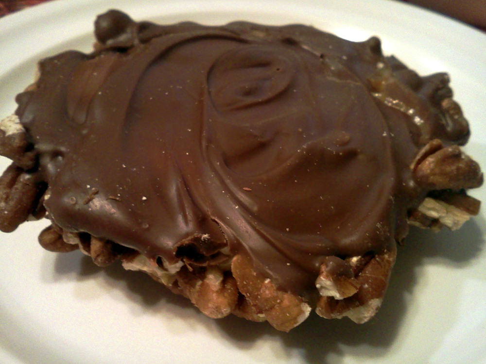 When I opened the box I saw the Monster Candy as seen in the first photo in this post in a sealed plastic bag. It already looked amazing, the chocolate seemingly swirled on top as thickly as Lee’s people could get it on there without being sloppy. Flipping it over on a plate, it became apparent the foundation of the Monster Candy is dozens of walnut halves. But what’s that glossy stuff that had seeped through the walnuts? I had forgotten they had posted this particular photo from inside the main of their three stores:
