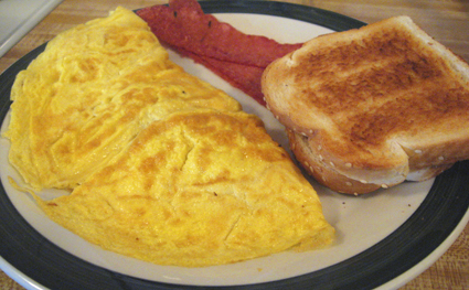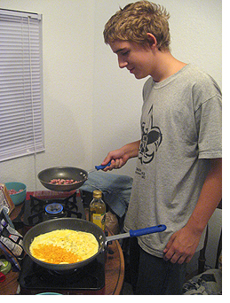 So, what do you do when you’ve got a 14-year-old like this one, who can whip up the kind of omelet you see in the above photo? That’s right, ya’ take him on the road! This is the same Adam of mine who lost his head for the camera a few posts back. In this image to the left, he’s actually cooking the omelet in the above pic. Turned out beautifully in my opinion. How cool is that? Here he’s in a small cottage in Canada using a pair of professional-grade butane stoves I’d picked up at an Asian grocery up in Ann Arbor, along with foodservice-grade WearEver Lincoln skillets with CoolTouch handles, which I’d gotten at GFS Marketplace. He made 10 omelets this past weekend, practicing for an omelet buffet he and I will be cooking for in mid-October. In this instance he’s used a store-brand olive oil, Egg Beaters, cubes of real ham, low-fat shredded cheese, and turkey bacon on the side with the toast. The previous day he was practicing with real bacon, and omelets made from real eggs mixed with 2% milk on both days. He’s getting pretty darn good at this. I think dad’s got some competition in the cooking area in this one. Bring it on, son! Dad’s so proud … 😉