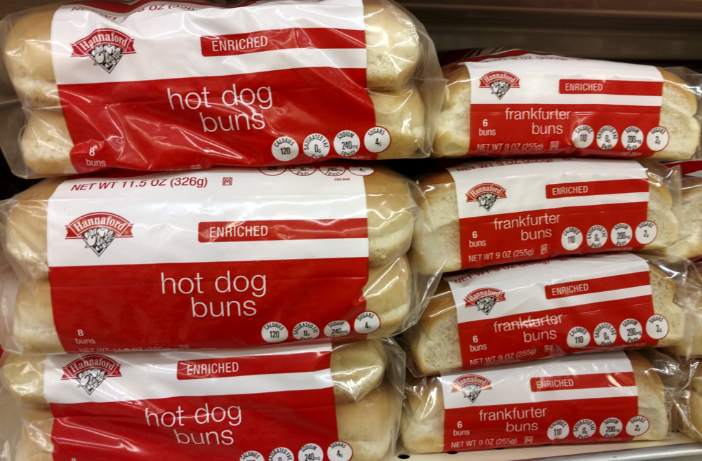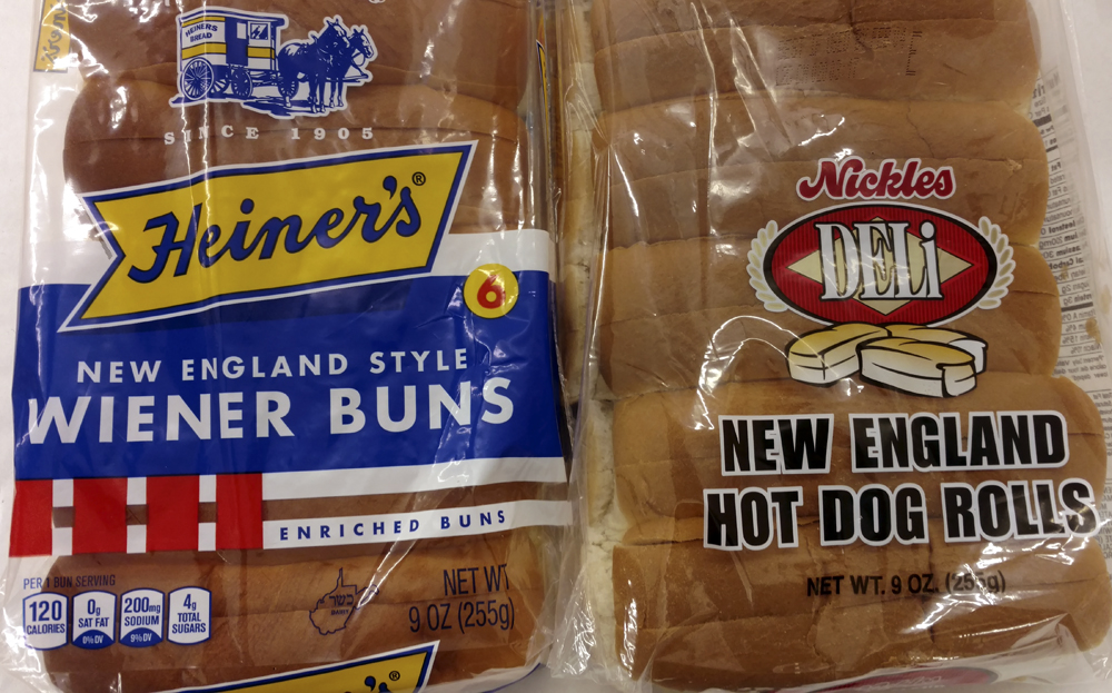 If making lobster rolls, make sure to use the correct bun. In New England it's called a Frankfurter Bun (above, right, compared to hot dog buns at a Hannaford grocery in Maine), but in the rest of the country it's generally known as a New England Roll (below, in a Piggly Wiggly in southeastern Ohio).