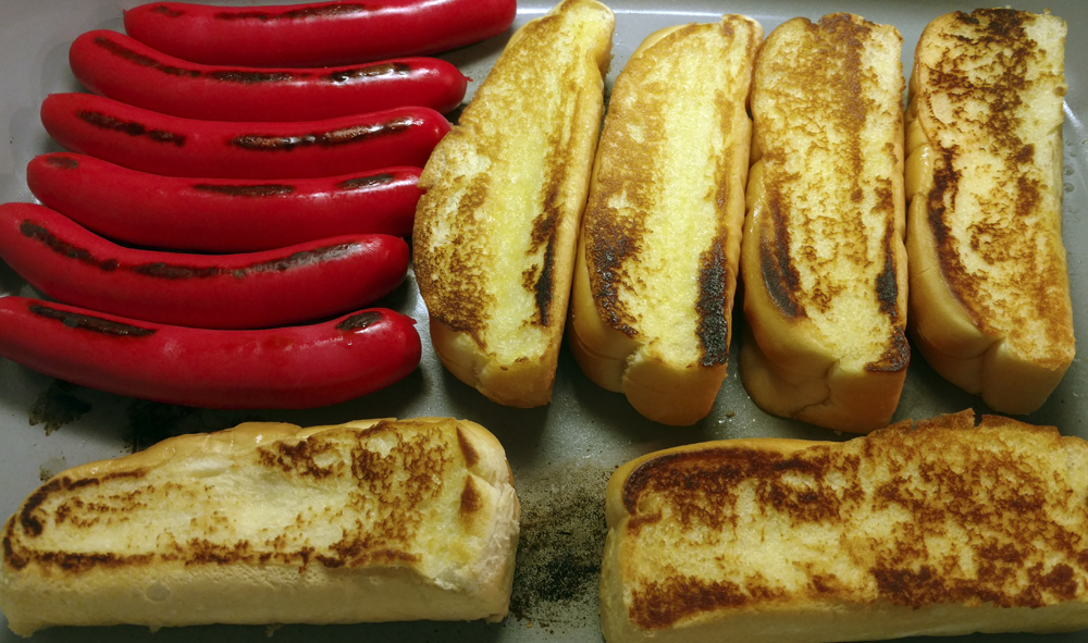 Franfurter Buns in Maine in my electric skillet with traditional Maine red hot dogs. This is how the buns should be prepared for lobster rolls.