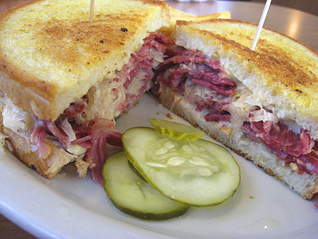Ah yes, a simple Reuben sandwich. Lots of tender corned beef, cheese, sauerkraut and thousand-island dressing on a good toasted rye bread, with a side of fries and slices from a real Kosher dill pickle. This has got to be one of the best meals there is when you really want something satisfying after a hard day when you’re already looking at a busy evening.