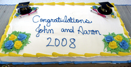 Yesterday afternoon Mary and I hosted the High School Graduation Party for both our sons at the Luna Pier Community Center. Her son John and my son Aaron are both graduating from Mason Schools here in southeast Michigan this afternoon. While I didn’t shoot pics of the food, we kept it simple, having what the boys wanted: 8 lbs fresh ground beef with 1 gal. + 1 qt. Manwich on hamburger buns, sweet & sour meatballs, American potato salad, macaroni salad, broccoli/cauliflower salad, a huge bowl of Bugles, and 20 2 liters of pop. Except for the broccoli/cauliflower salad (which my sister made), everything was from a restaurant supply shop (GFS Marketplace for those who have one nearby). The full sheet cake, white on one end, chocolate on the other, with whipped icing, was a custom cake from Kroger.