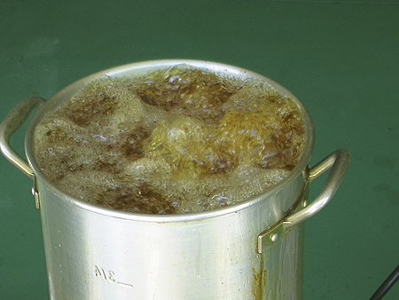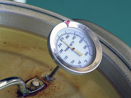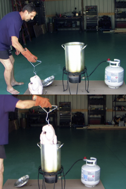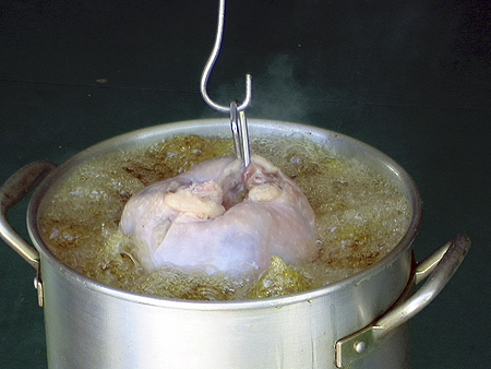 Simple physics: As the bird goes in, the oil level rises. This was a big bird, so the oil was about as high as possible as the dip was finished. Be patient, and don’t hurry. Oh, and wear shoes …