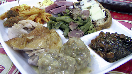 My dinner plate from this afternoon; Roast chicken, meatballs, Uncle Al’s rich baked beans (yeah, those are baked beans on the front-right!), green beans & ham, penne and sausage (which I made this morning), sliced baked ham, deviled eggs, and cinnamon raisin bread. Click the image for a larger version.