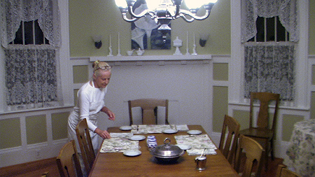 Our hostess, Jo Ann, sets the table for the early-morning frittata breakfast.