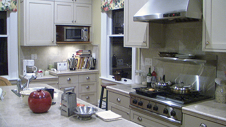 The kitchen in the North Street Inn is well-equipped for larger groups. All the equipment is GE professional grade, including a pair of ovens installed in a cabinet near the dining room door. The gas stove has the continuous but sectional cast iron grates which allow pots and pans to be place anywhere on the surface. And the central island contains the much-needed prep sink that’s so useful in preparing fruits and vegetables.