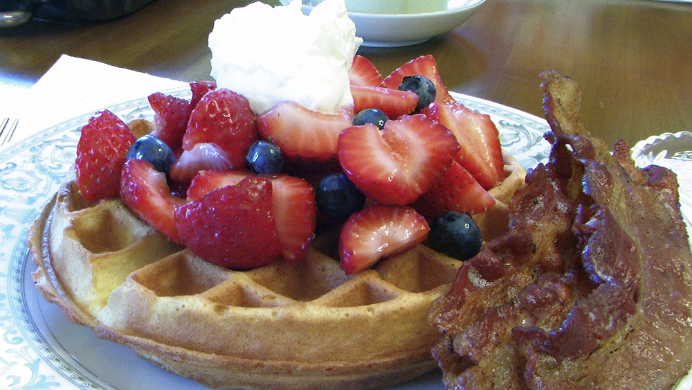 How often do you search the grocery for fresh berries and not find too many? The strawberries and blueberries on top of these waffles Saturday morning were exquisite, complementing the waffles perfectly. The thick bacon was cooked just the way we like it, without our even asking. And I saw Jo Ann whip the topping herself. This is the kind of thing they’ll charge $12.50 for at a nice hotel but it won’t be nearly this good there.