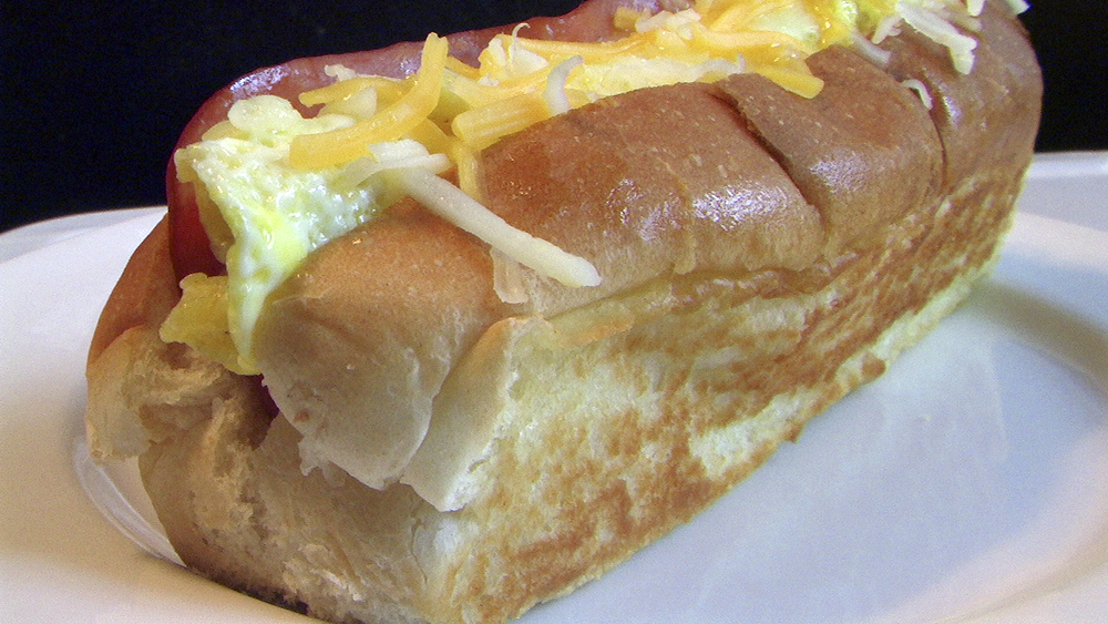 To assemble, lay the ham in the bun. Using a spatula, roll the egg into the shape of a hot dog and lay it in the bun next to the ham. Top with the shredded cheese and serve.