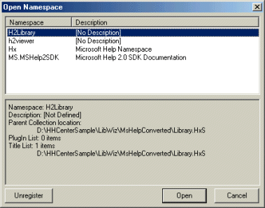 Rob Chandler has kindly added another dialog to the converter. The converter has a File menu, and the first item is Open Namespace. Clicking on this menu item will open Rob's dialog, which lists all the MS Help 2.0 namespaces that are registered on the system: